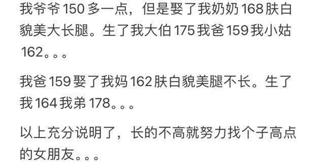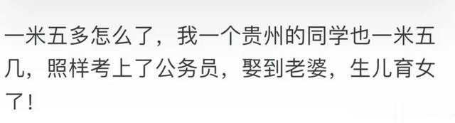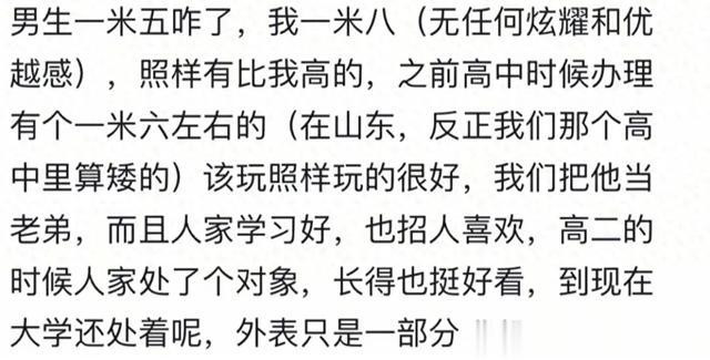 兄弟们不要自卑了,朋友一米六 谈过五六个女朋友最高的一米七最矮的一个1米45现在结婚了老婆一米六五,孩子都二岁了。以前读书真的自卑啊。后来慢慢发现 既然改变不了就大胆接受。